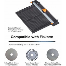 The Fiskars Recycled Rotary Paper Trimmer is a high-performance, eco-conscious solution for precision cutting. Built with a base made from 100% recycled material, it’s designed for both heavy everyday use and sustainable living. The titanium carbide coated Ø45mm rotary blade is three times harder than steel, ensuring enhanced durability and cutting capacity. With metric and imperial measurement guides, a pivoting cutting rail, and a Softgrip ergonomic carriage, it offers precision and comfort in every cut. The long-lasting cutting bar provides up to 8 uses before needing replacement. Suitable for portrait format up to A4 and landscape format up to A3, and it cuts up to 15 sheets of 80gsm paper at once. Compatible with a variety of decorative and scoring blades for even more versatility.