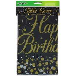 The Oaktree Happy Birthday Sparkling Fizz Black & Gold Colourfast Plastic Table Cover is designed to add a touch of luxury to your birthday celebration. Featuring a black background with sparkling gold accents and "Happy Birthday" text, this table cover is perfect for making your special occasion extra memorable.