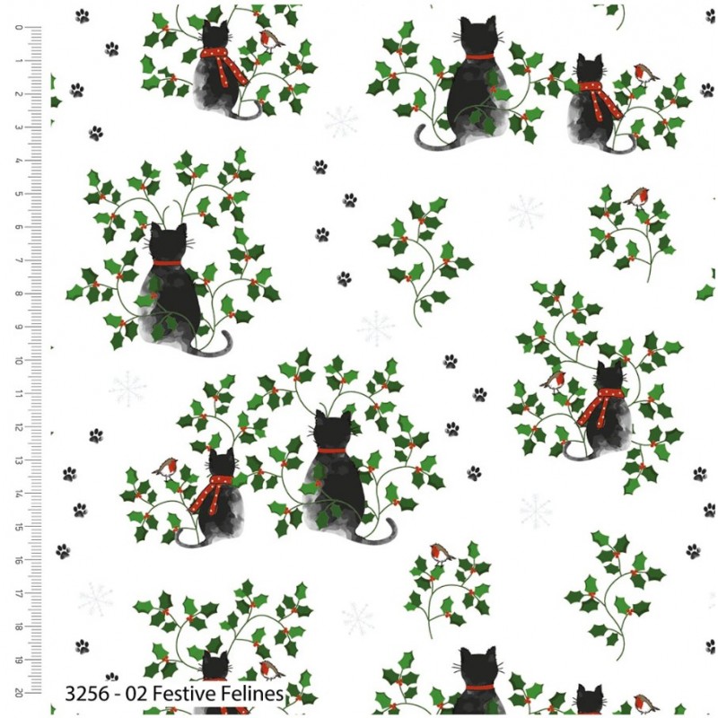 (REMNANT) 100% Cotton Festive Felines Christmas Holly Fabric Approx 34cm x 110cm