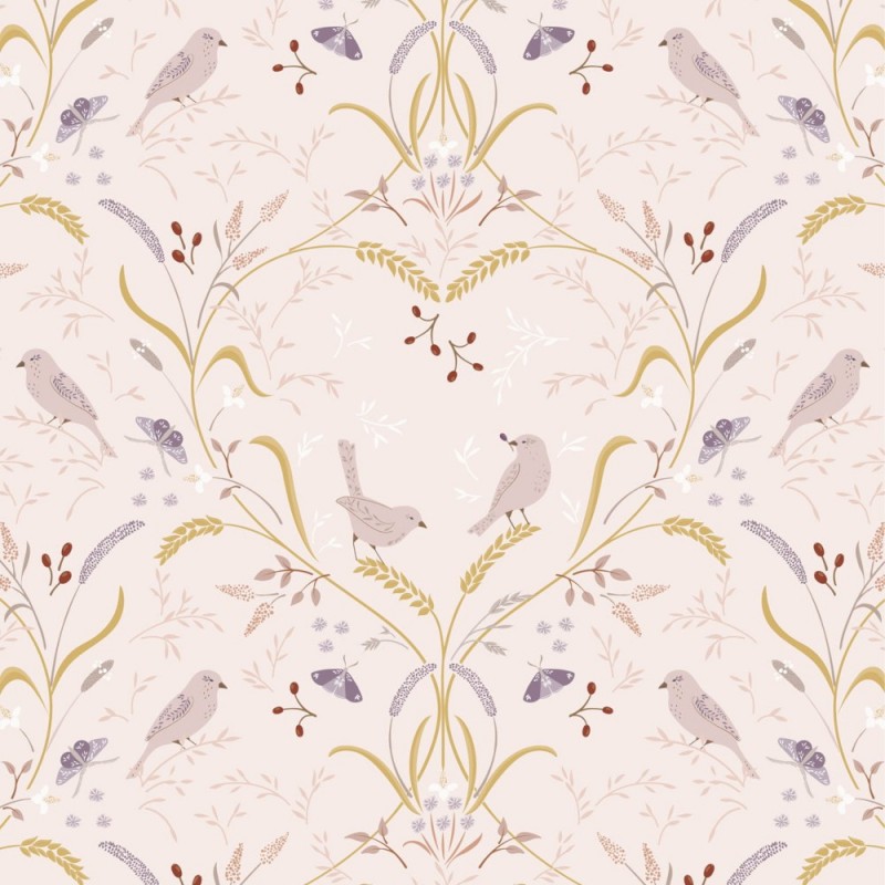 (REMNANT) 100% Cotton Fabric Lewis & Irene Meadowside Birds Ecru Pink Approx 38cm x 112cm