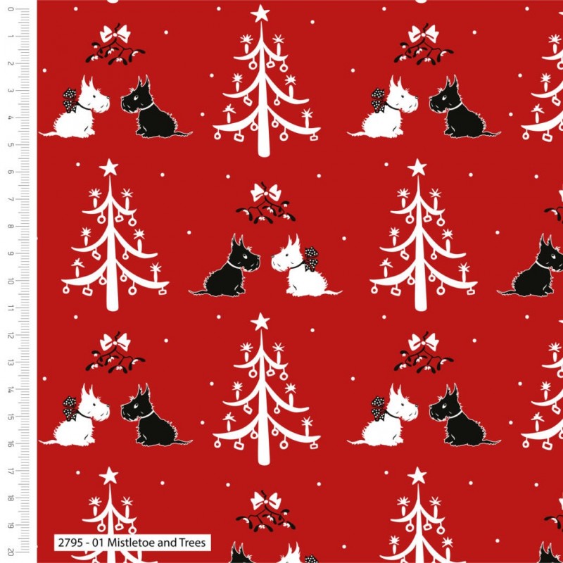 (REMNANT) 100% Cotton Fabric Christmas Wish Scottie Dogs Mistletoe Trees Festive Approx 50cm x 56cm
