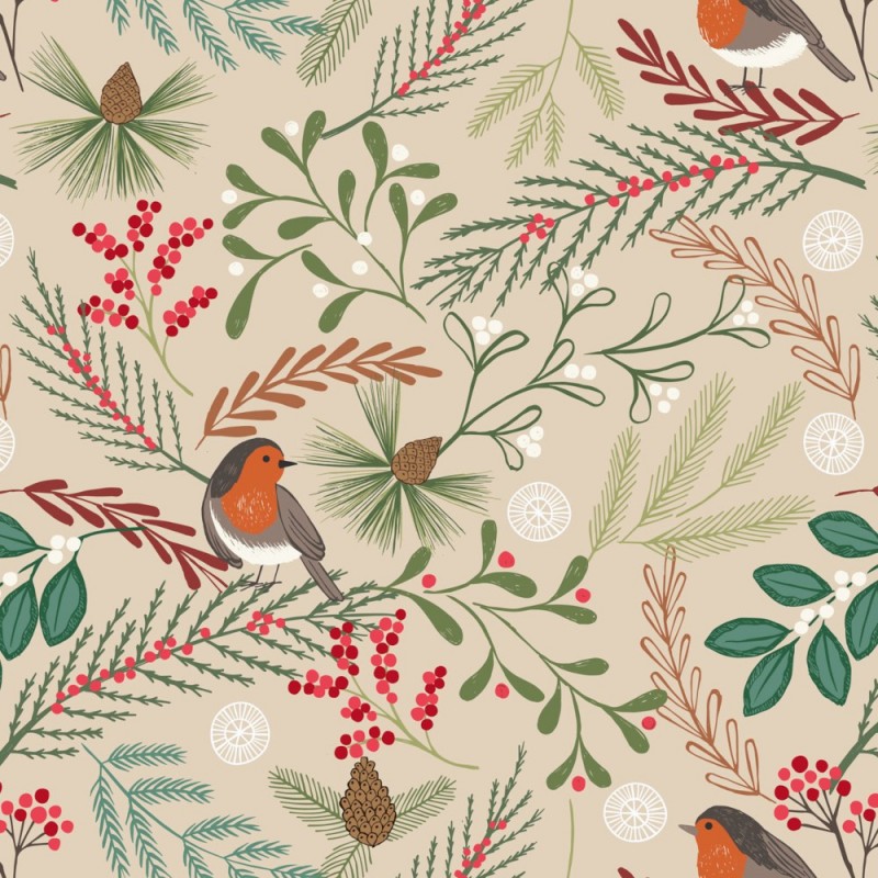 (REMNANT) 100% Cotton Flannel Fabric Lewis & Irene Winter Robin Dark Cream Approx 16cm x 112cm
