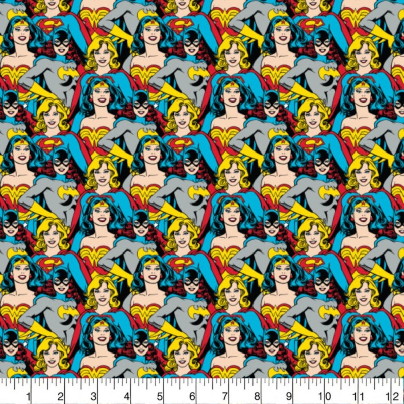 (REMNANT) 100% Cotton Fabric Camelot DC Comics Heroines Stacked Wonder Woman Batgirl Approx 22cm x 112cm