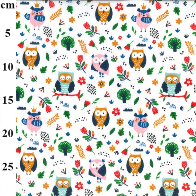 (REMNANT) Polycotton Fabric Owls Forest Trees Flower Floral Birds Wildlife Approx 49cm x 112cm
