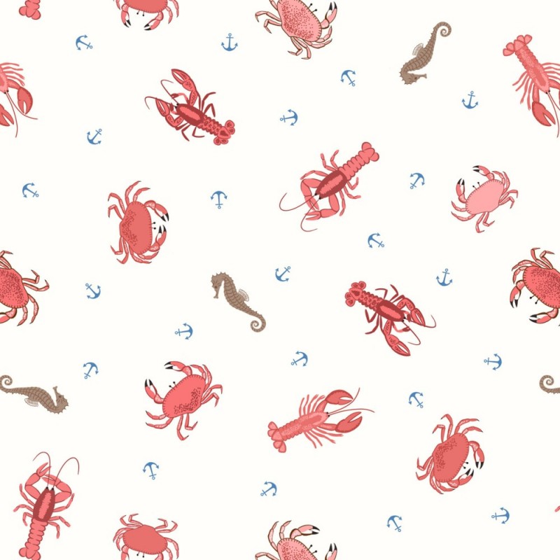 (REMNANT) 100% Cotton Fabric Lewis & Irene Crab Lobster Seahorse Cream Approx 71cm x 112cm