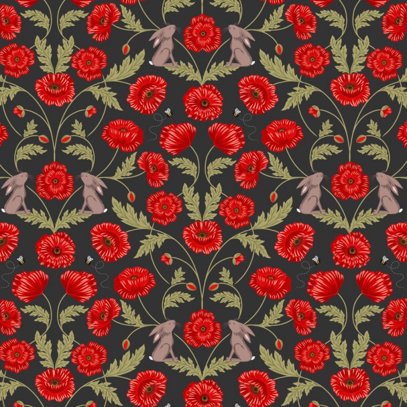 (REMNANT) 100% Cotton Fabric Lewis & Irene Mirrored Poppies & Hares Floral Dark Approx 36cm x 112cm