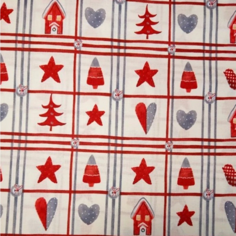 (REMNANT) 100% Cotton Fabric Scandinavian Christmas Stars Trees Hearts Houses Approx 93cm x 136cm