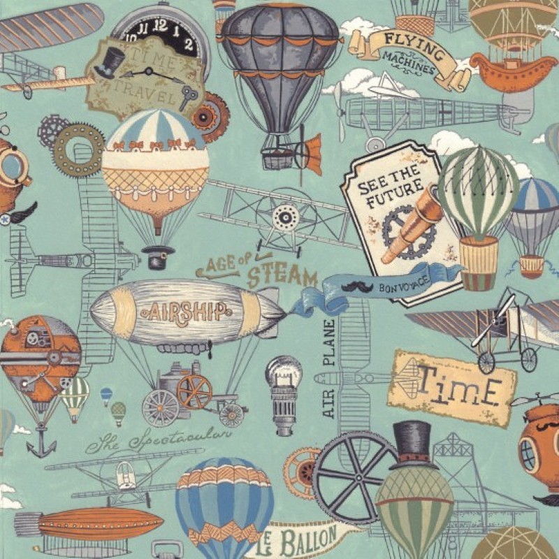 (REMNANT) 100% Cotton Fabric Nutex Victorian Vintage Flying Machines Vehicles Planes Blimp Approx 42cm x 112cm