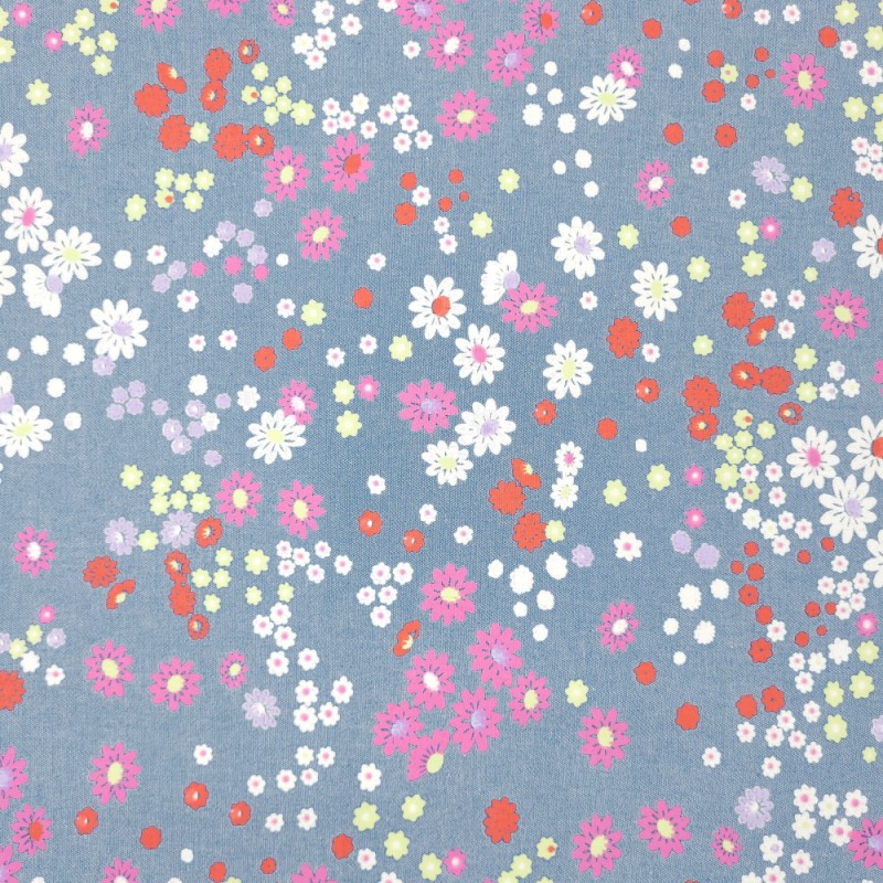 (REMNANT) 100% Cotton Fabric Bright Flowers Multicoloured Chambray Denim Approx 54cm x 150cm
