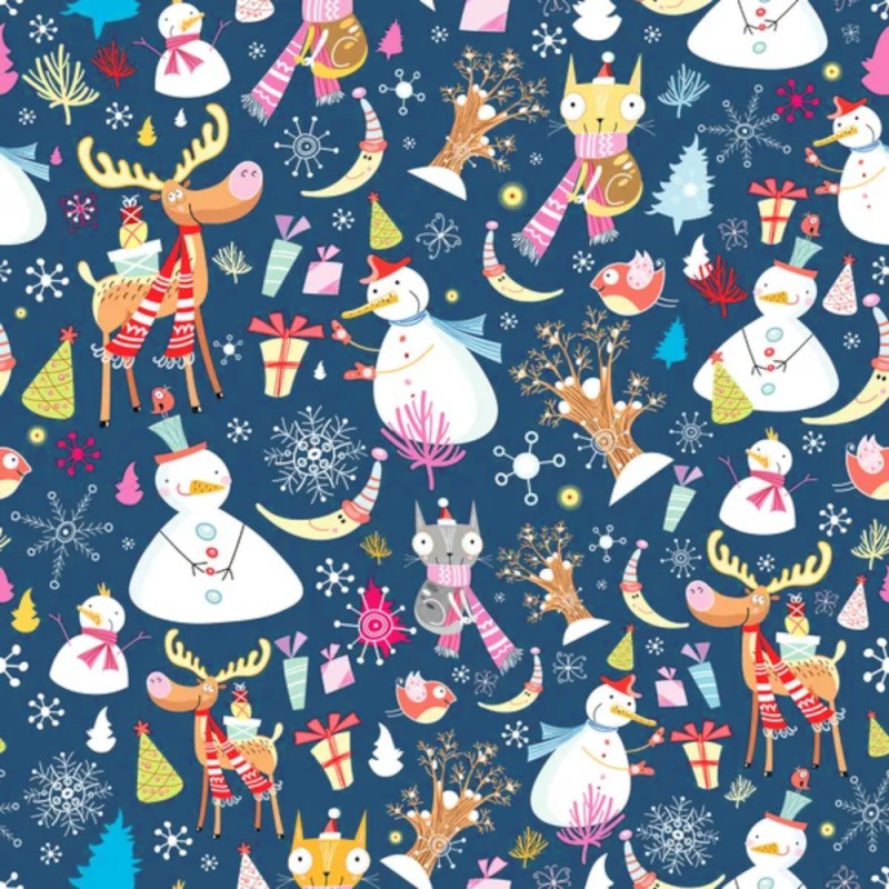 (REMNANT) 100% Cotton Fabric Christmas Snowman Reindeer Cats Characters Presents Approx 47cm x 140cm