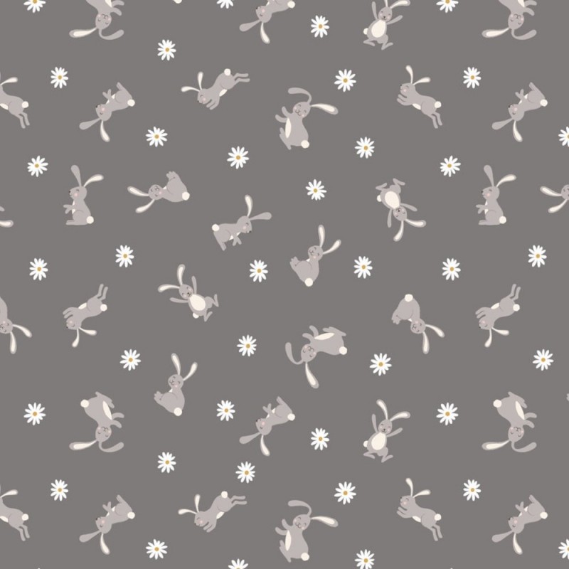 (REMNANT) 100% Cotton Fabric Lewis & Irene Bunny Hop Rabbits Daisies Grey Approx 77cm x 112cm