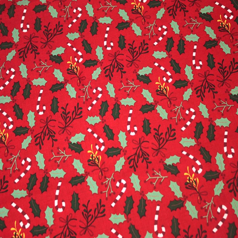 (REMNANT) 100% Cotton Poplin Fabric Christmas Holly Leaves Candy Cane Festive Print