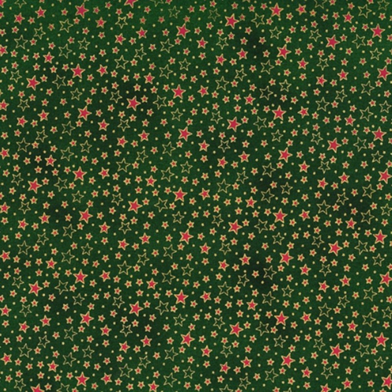 (REMNANT) 100% Cotton Fabric Christmas Metallic Star Print Green Red & Gold Festive Blender Approx 39cm x 110cm