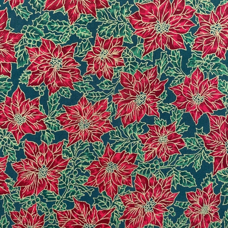 (REMNANT) 100% Cotton Fabric Christmas Poinsettia Gold Metallic Floral Green Festive Print