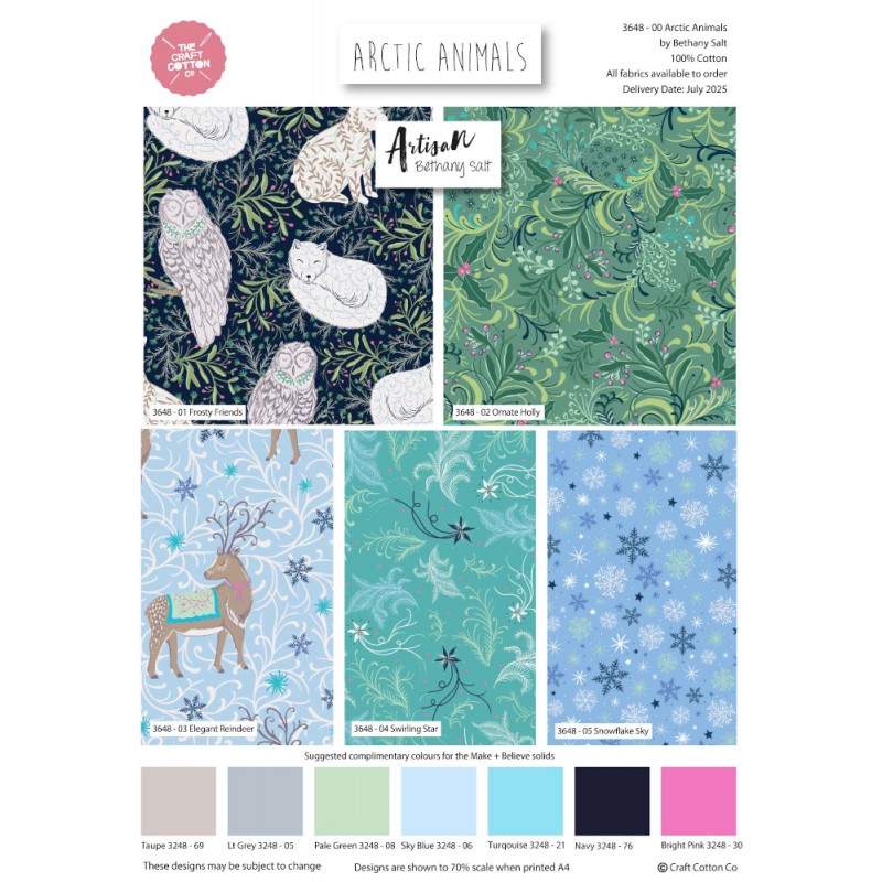 The FQ Arctic Animals Pack is part of the Arctic Animals collection, designed by Bethany Salt for Craft Cotton Co. This fat quarter bundle includes five festive designs, featuring woodland animals, foliage, reindeer, stars, and snowflakes in wintry colourways.