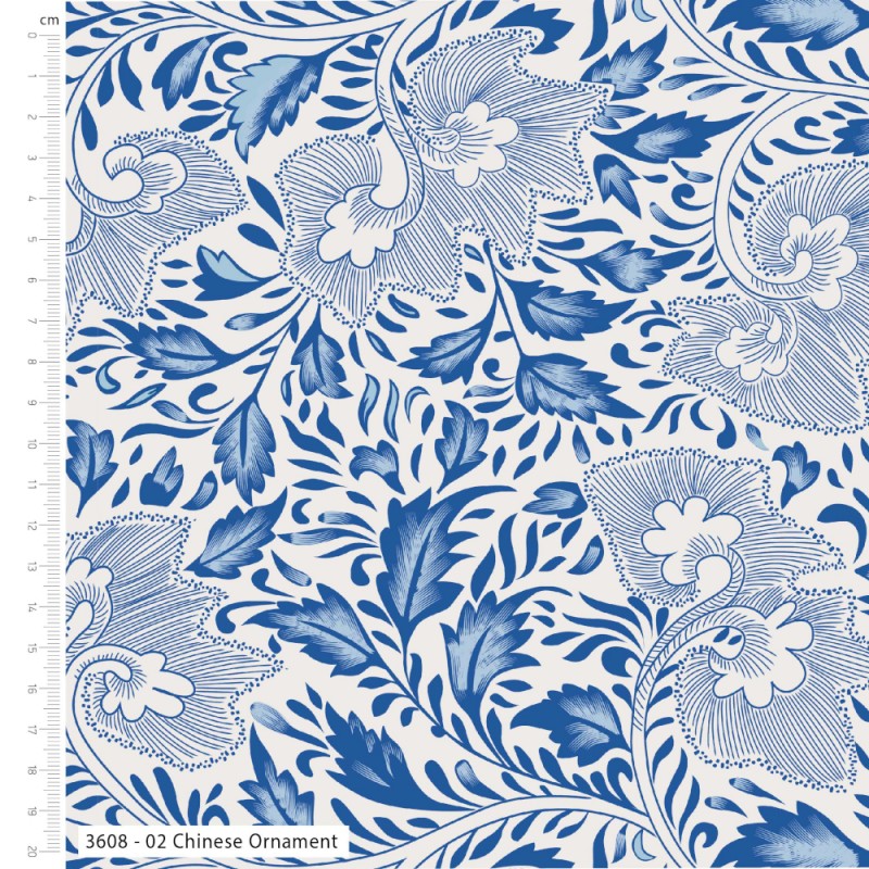 Chinese Ornament is part of the Crafts of Tranquility collection from the V&A. This elegant design features intricate floral motifs in soft blue tones, set against a white background, creating a modern yet timeless look.