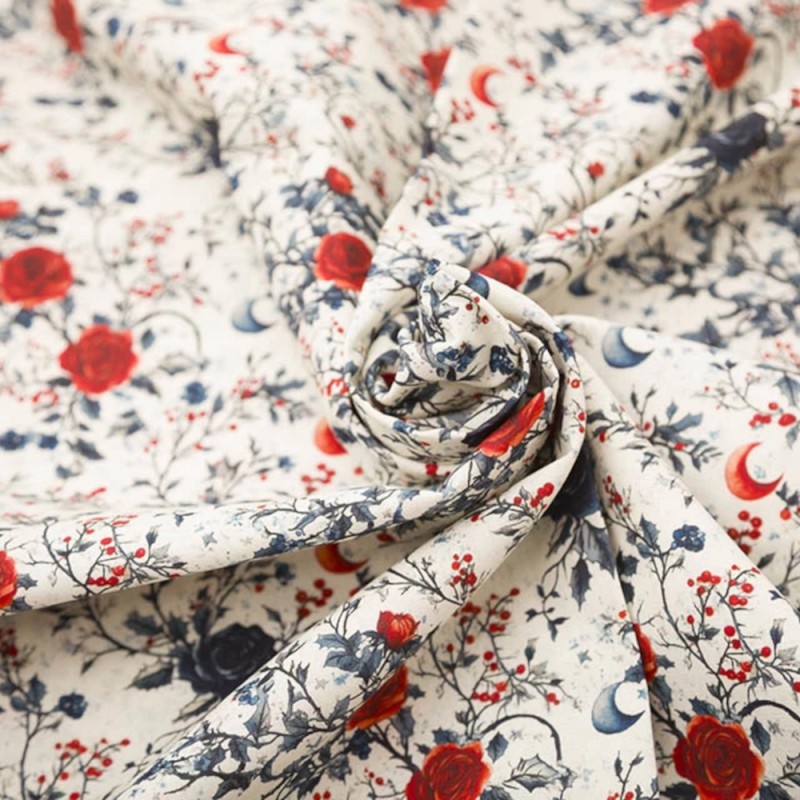 Festive Floral is part of the Mindy Digital collection by Empee. This elegant digital print features rich red and dark blue roses intertwined with dark blue twigs, small blue leaves, crescents, and clusters of red berries on a crisp white background. The repeating pattern creates a balanced, visually appealing design that adds a festive and sophisticated touch to your sewing and craft projects.