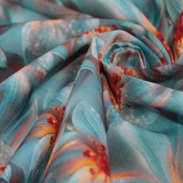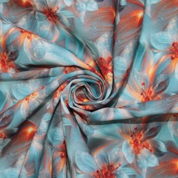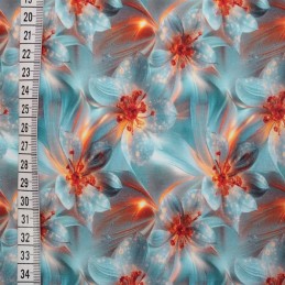 3D Flowers is part of the Mindy Digital collection by Empee. This striking digital print features bold blue flowers with vivid orange stamens, surrounded by dynamic orange light streaks on a clean white background. The design has a contemporary, three-dimensional look that creates depth and movement, making it a standout choice for statement pieces and modern sewing projects.