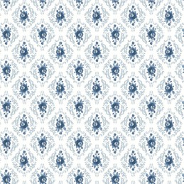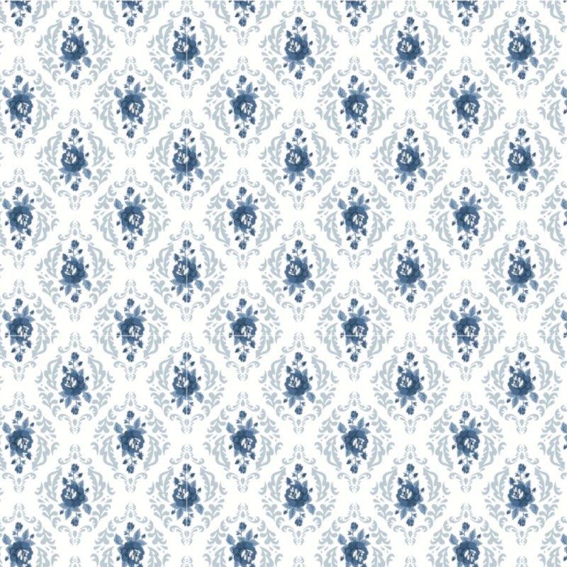 The Rose Damask design from the Lakeland Blues collection by Samantha Walker features a classic damask-style pattern with roses, scrolling leaves and decorative floral details. The motifs are arranged in a structured, repeating layout, creating a balanced and traditional look.