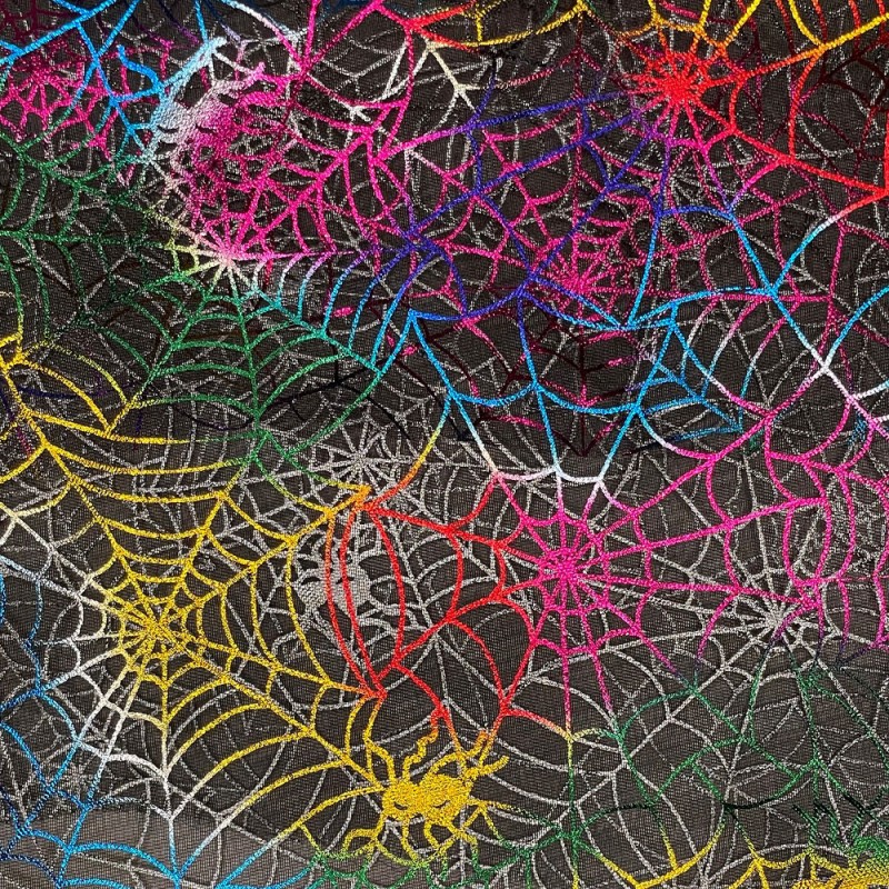 Lightweight sheer organza with metallic foil spiderweb and spider motifs