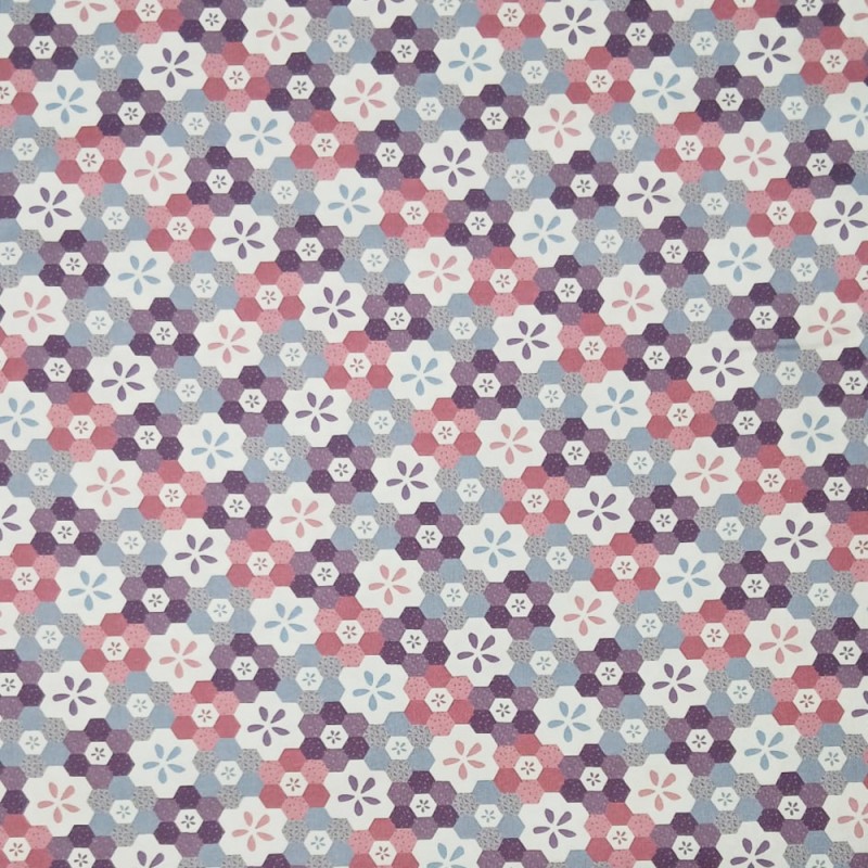 The colour palette includes shades of purple, pink, blue, grey and white, giving the fabric a coordinated look with a subtle vintage or retro-inspired feel. Printed on 100% cotton, this design works particularly well for quilting, patchwork and craft sewing, where the repeating pattern can be used consistently across blocks and panels.