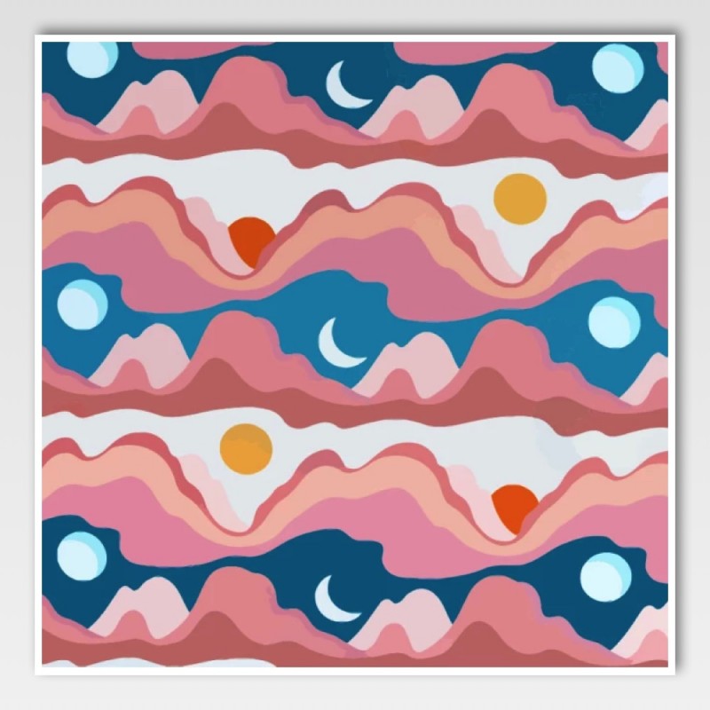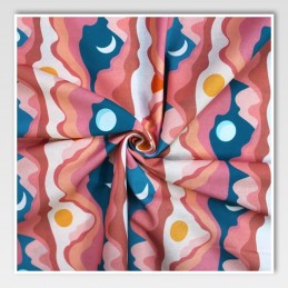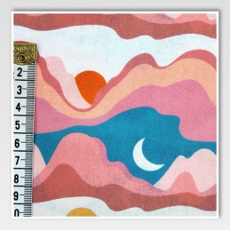 Bring a bold and vibrant flair to your creations with the Little Johnny Digital Cotton Mountains fabric. This colourful design features dreamy mountain silhouettes layered with suns, moons, and celestial blues, all digitally printed for sharp, long-lasting colour. It’s perfect for making fun, modern and eye-catching garments or décor.