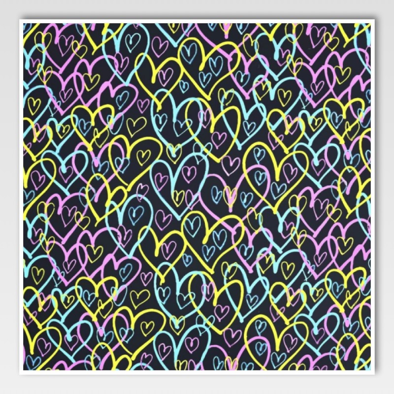 Digitally printed with vibrant neon heart scribbles on dark navy/black base
