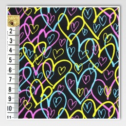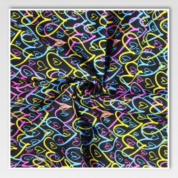Add a splash of fun and colour to your next sewing project with the Little Johnny Heart Scribbles cotton fabric. Featuring a lively neon doodle-style heart design on a dark background, this playful pattern is perfect for bold and cheerful creations.