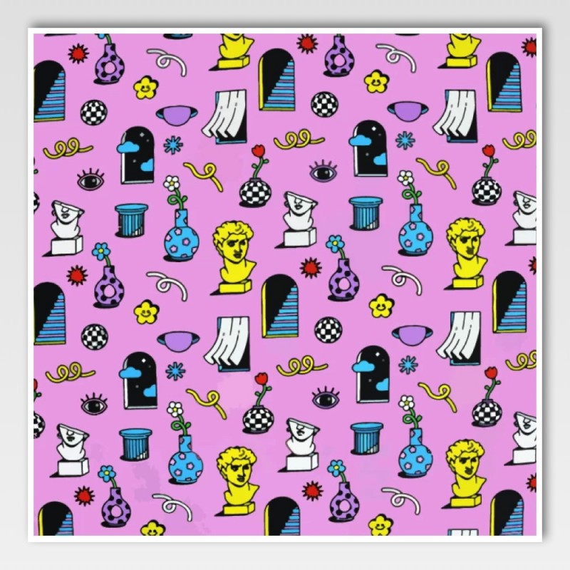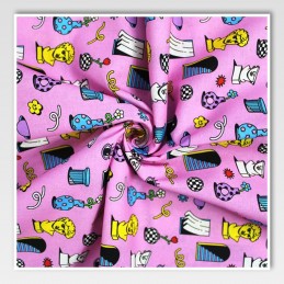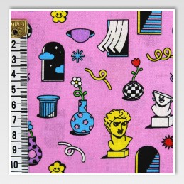 Unleash creativity with the Little Johnny Graphic Story cotton fabric. This vibrant and playful fabric features quirky graphic designs with bold pops of color, including yellow busts, flowers, and geometric shapes, all set against a soft pink background. Perfect for creating unique and stylish creations that reflect your personality!