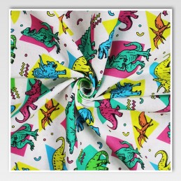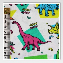 Take your sewing projects back in time with this fun and funky retro-style dinosaur print from Little Johnny. Featuring a bold 80s-style geometric backdrop and vibrant neon dino characters, this digitally printed fabric is a standout choice for kidswear, crafts, and creative décor. Made from 100% breathable cotton, it's soft, durable, and a dream to work with.
