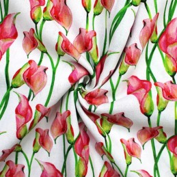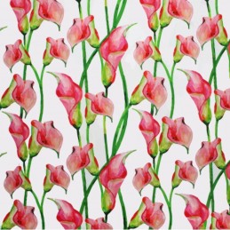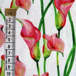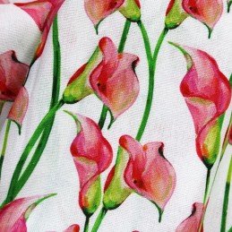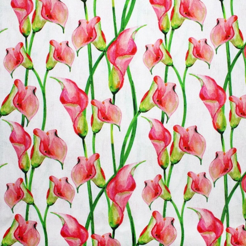 Calla from Little Johnny’s Linen Mix collection features a refined botanical print of pink calla lilies with long green stems arranged across a white background. The flowers are elegantly illustrated with soft curves and painterly detail, offering a gentle sense of movement without overpowering the eye.