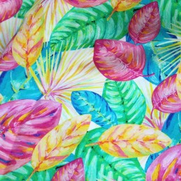 Painted Leaves from Little Johnny’s Linen Mix range features a layered print of overlapping leaves in a range of hues. The print is designed to have a painterly quality with visible brushstroke-like detailing.