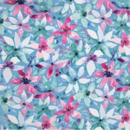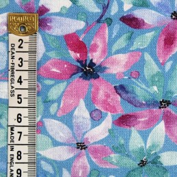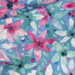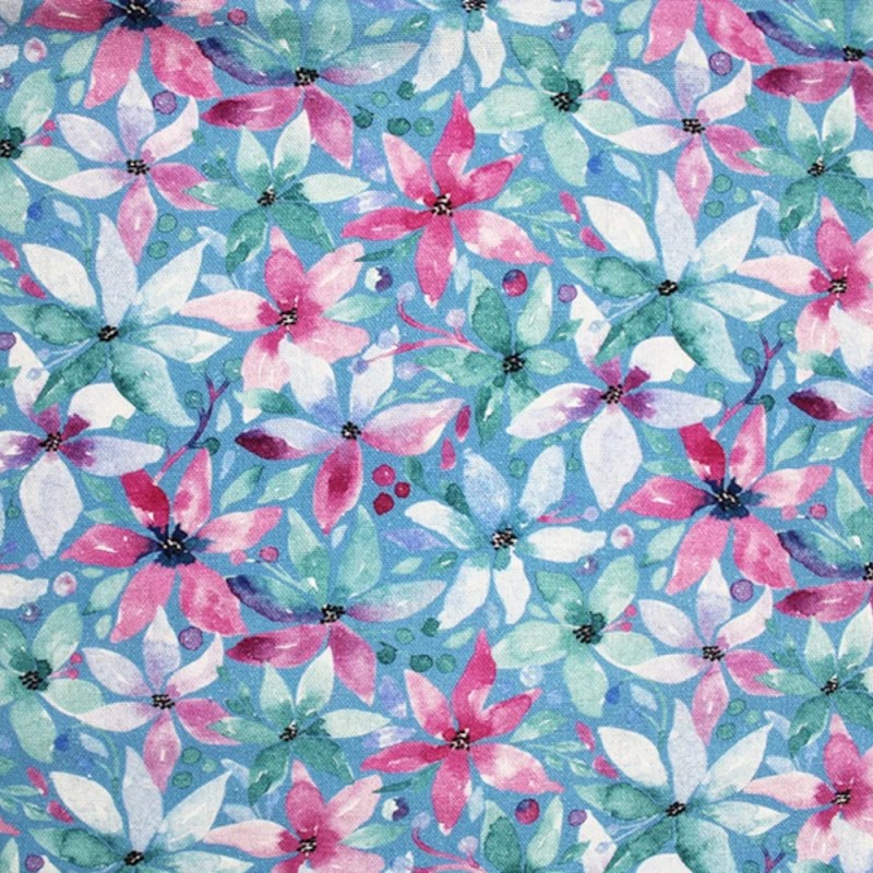 Painted Flowers – Spa Road from Little Johnny’s Linen Mix range features a soft, watercolour-style floral print. The design shows delicate flowers in shades of pink, green, white, and blue, arranged on a rich blue background. The overall effect is painterly, airy, and elegant.