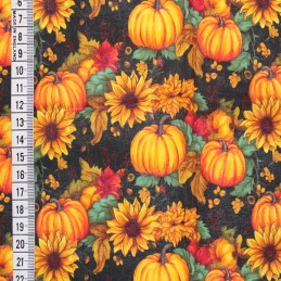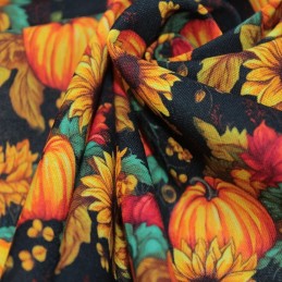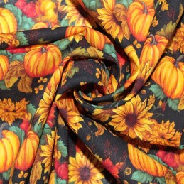 The Little Johnny Digital Pumpkins fabric is a striking digital cotton print from Little Johnny. Featuring bold pumpkins, autumnal flowers, and seasonal foliage set against a rich black background, this design brings an elegant autumn-inspired look to your sewing projects.