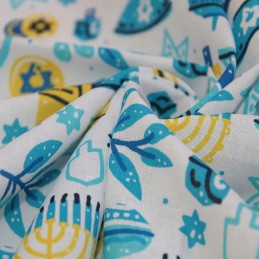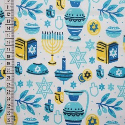 The Little Johnny Digital Cotton Hanukkah Blue fabric is a beautifully detailed digital cotton print from Little Johnny. This design features a repeating pattern of Hanukkah-themed symbols, including menorahs, dreidels, Stars of David, and olive branches, all illustrated in shades of blue and yellow against a white background.