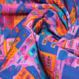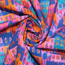The Little Johnny Digital Cotton Townhouses fabric is a cheerful digital cotton print from Little Johnny, featuring digitally illustrated houses in a playful design scattered across a soft pink background. This fabric brings a bright, urban-inspired look to any sewing or craft project, perfect for adding a touch of whimsy.