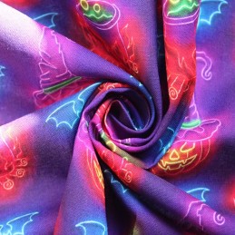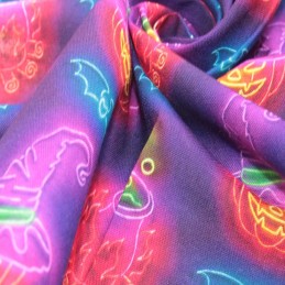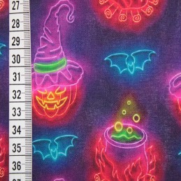 The Little Johnny Digital Cotton 3D Pumpkins fabric is a striking digital cotton print from Little Johnny, featuring jack o’ lanterns in witches’ hats, bats, and bubbling cauldrons, all illustrated in a vivid multicoloured neon sign style on a deep black background. The glowing effect gives the fabric a unique 3D appearance, making it perfect for Halloween-themed projects, costumes, decorations and bold accessories.