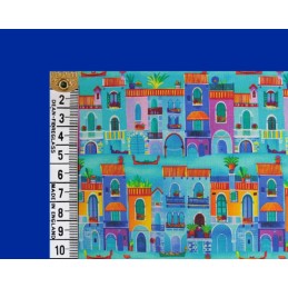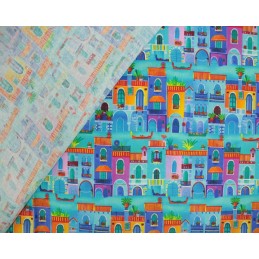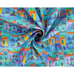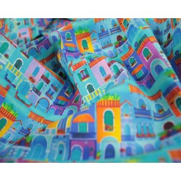 The mix of turquoise, orange, purple, and yellow buildings creates a bold, playful look, perfect for statement garments and standout home décor pieces. The stylised architecture and coastal inspiration give this fabric a modern yet timeless appeal.