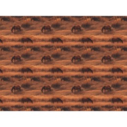 Capture the beauty of the countryside with this stunning Photorealism Horses fabric from E Studio. This highly detailed digital print showcases graceful horses grazing in warm, golden fields, creating a peaceful and natural scene full of depth and realism.