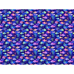 Make a splash with this vibrant Colourful Fish fabric from E Studio. This lively digital print features an array of bright, multicoloured fish swimming among coral and sea plants, set against a deep ocean-blue background.