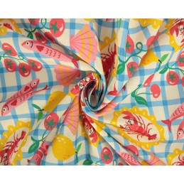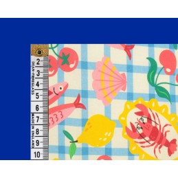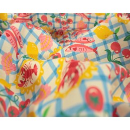 The combination of food and seaside elements gives this fabric a fun, summery feel, perfect for unique garments, kitchen accessories, and creative makes. The structured check pattern keeps the design balanced while the colourful motifs add personality and charm.
