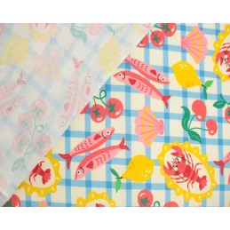 Add a playful twist to your sewing projects with the charming Seafood Picnic fabric from Little Johnny. This quirky design features a delightful mix of lobsters, fish, shells, tomatoes, cherries, and lemons, all set against a classic blue gingham background for a fresh picnic-inspired look.