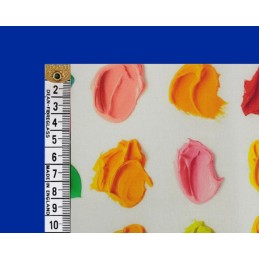 With shades of pink, orange, yellow, green, blue, and purple, this fabric captures the feel of an artist’s palette, making it perfect for creative projects and expressive designs. The scattered layout keeps the pattern playful while maintaining a neat and balanced appearance.