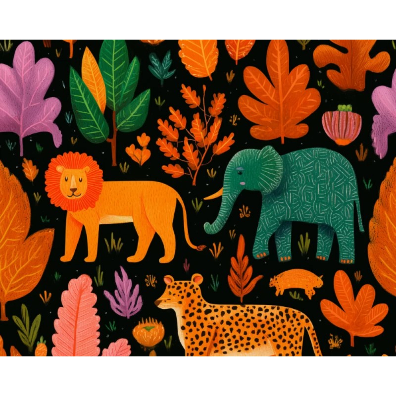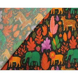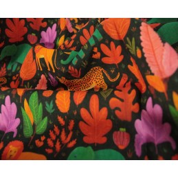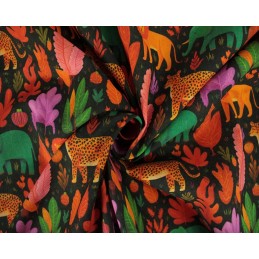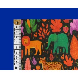 Bring bold colour and wild charm to your projects with the vibrant Jungle Jamboree fabric from Little Johnny. This lively design features beautifully illustrated jungle animals including lions, elephants, and leopards, surrounded by stylised leaves and foliage on a striking dark background.