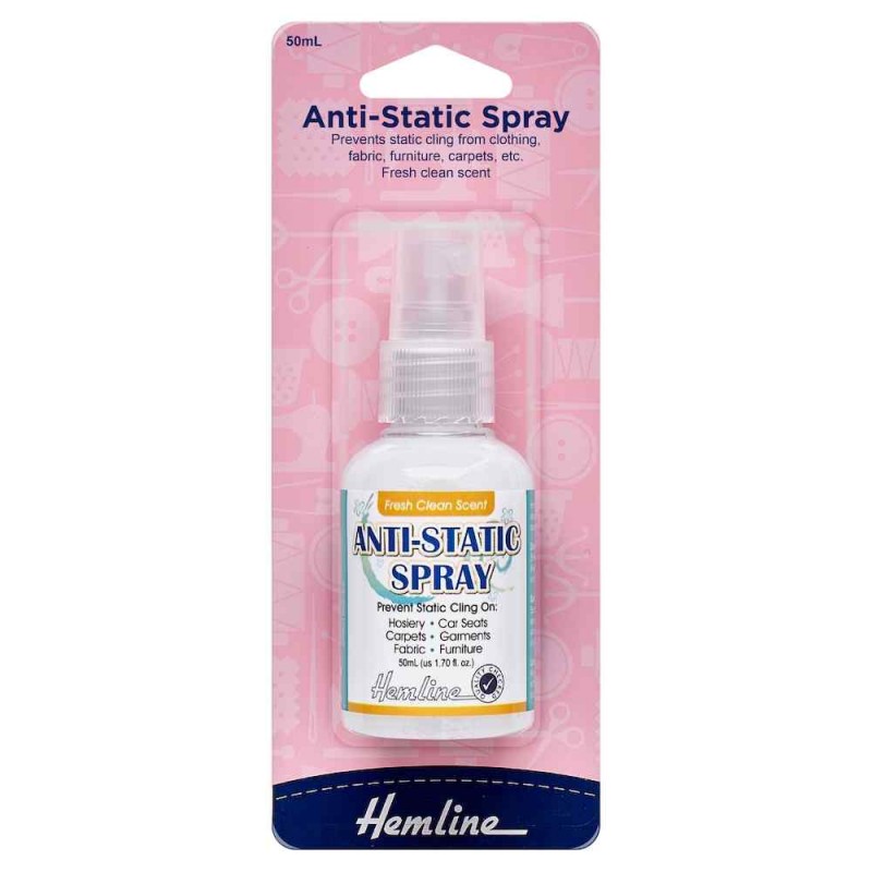 Hemline Anti-Static Spray is a convenient and effective solution for preventing static cling on a wide range of materials including hosiery, car seats, carpets, garments, fabric, and furniture. The fresh clean scent leaves fabrics smelling pleasant while eliminating annoying static. The easy-to-use spray bottle delivers a fine mist that quickly neutralizes static electricity. Compact and portable, this 50ml bottle is perfect for keeping in your sewing kit or handbag for quick refreshes.