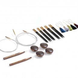 Summary Set includes 9 pairs of 10cm (4in) interchangeable ebony wood tips in sizes 3.0 to 6.0mm Includes 2 nylon-coated stainless steel swivel cords in lengths 40 and 50cm Comes with 4 wooden end caps, 2 tightening tools, and 5 colorful tassel stitch markers Packaged in an embroidered Khadi soft silk zippered case for secure storage Ebony wood...