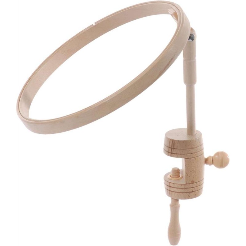 Attach the clamp securely to a table edge or work surface up to recommended thickness. Adjust the hoop height and angle to your preferred working position. Place your fabric tightly in the hoop and use the knurled brass screw to achieve the right tension. Use hands-free embroidery frame to improve stitching accuracy and reduce strain. When not in use, store in a dry place to maintain the polished wood finish.