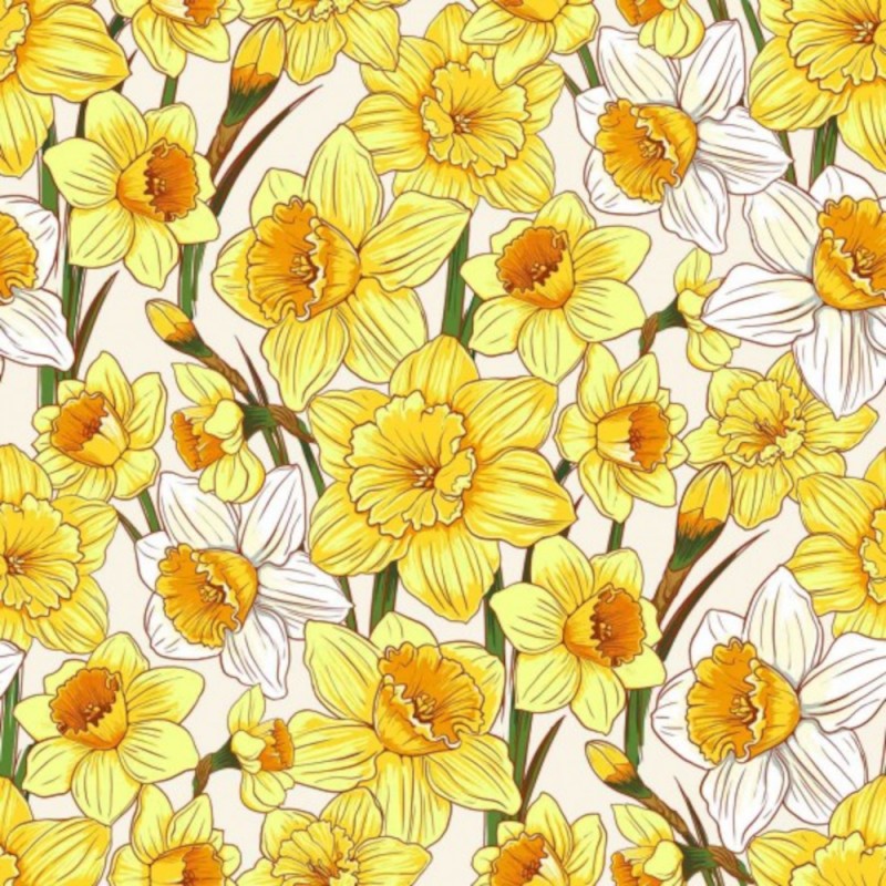 Daffodils – Buck Close from Nutex’s Flower Market collection is a cheerful floral cotton featuring bright yellow daffodils lightly scattered across a soft beige background. This versatile floral print brings a fresh and airy feel, perfect for spring and summer sewing projects.
