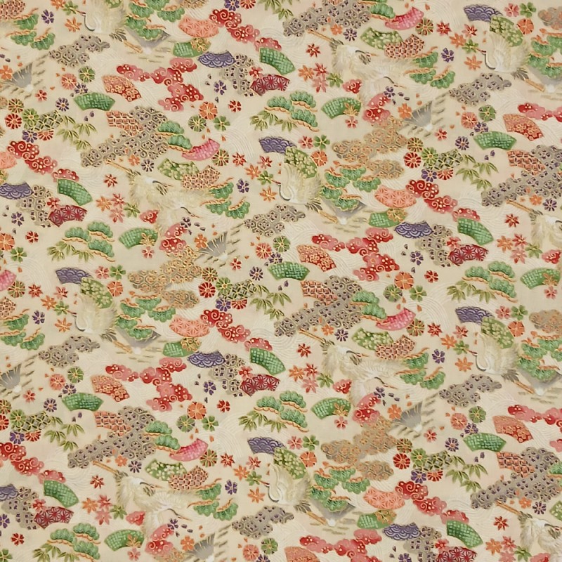 Ashi Cranes by Nutex is a stunning Japanese cotton print featuring elegant cranes with outstretched wings in soft white with gold metallic highlights. The design includes stylised clouds in red, green, lavender, and pink, alongside cherry blossoms, subtle pine and bamboo motifs, and delicate floral elements on a warm beige or black background.