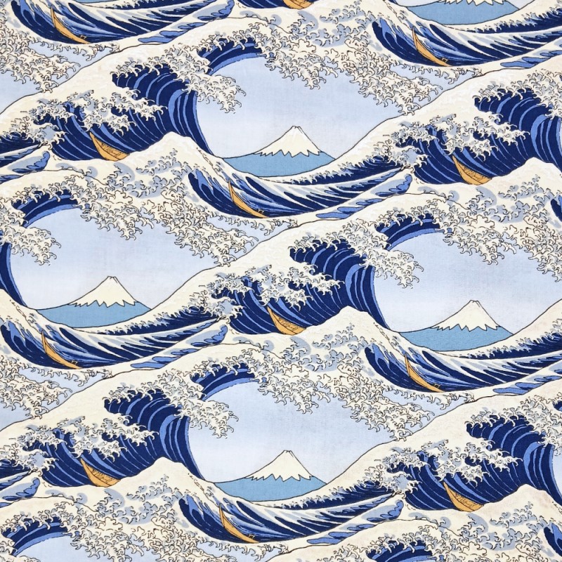 Fujian by Nutex is a striking Japanese cotton print featuring stylised mountains and sea waves in a traditional Japanese art style, enhanced with shimmering metallic detailing throughout. The intricate pattern evokes a sense of movement and cultural richness, perfect for crafting or sewing projects with a bold, artistic flair.